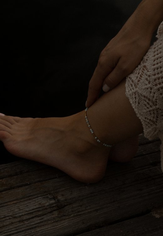 Bransoletka na stopę OCEAN to ręcznie wykonany model, łączący naturalny Turkus z eleganckim pozłacanym srebrem 925 (2 mikrony 24-karatowego złota). Lekka, uniwersalna i subtelna, idealna jako akcent w letnich stylizacjach lub w duecie z innymi bransoletkami.