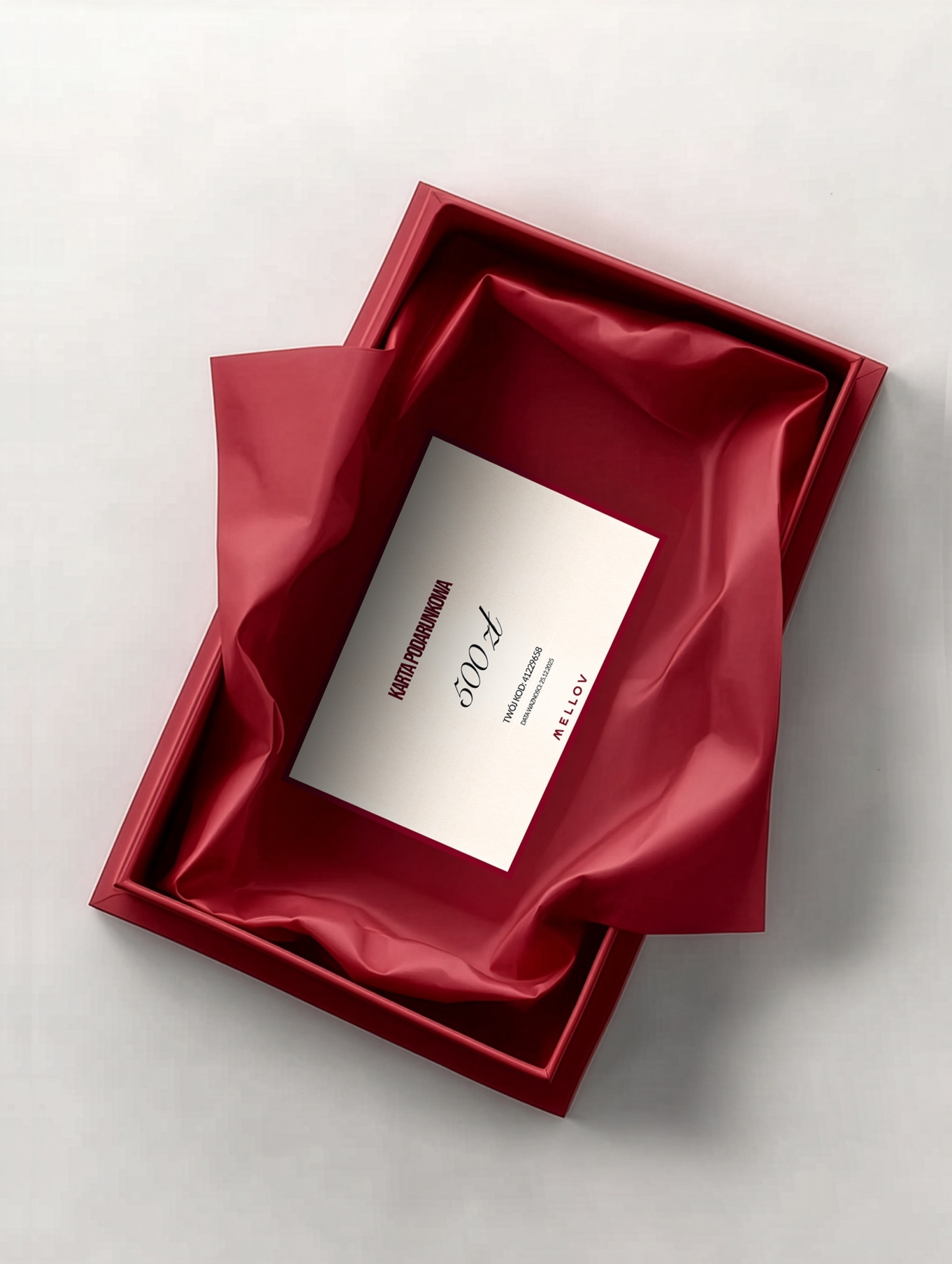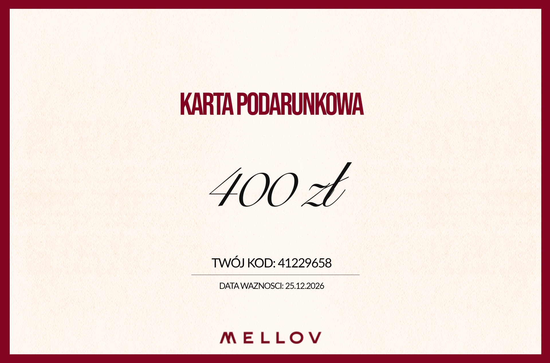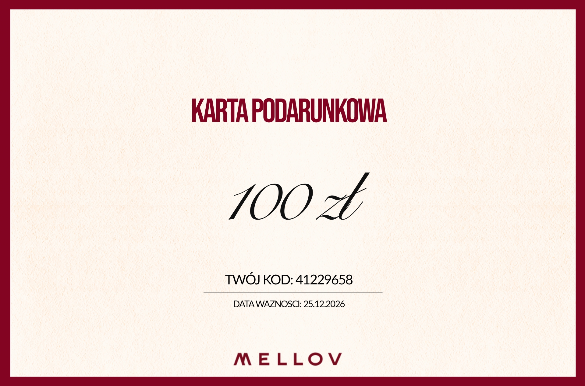 Nie wiesz, co wybrać? Karta podarunkowa Mellov załatwia temat. Idealna, gdy chcesz podarować coś wyjątkowego, ale pozwolić jej wybrać dokładnie to, co naprawdę wpadnie w oko. Dostępna w kilku wartościach, od razu gotowa do wysyłki. Prosto, wygodnie, zawsze trafiony prezent.