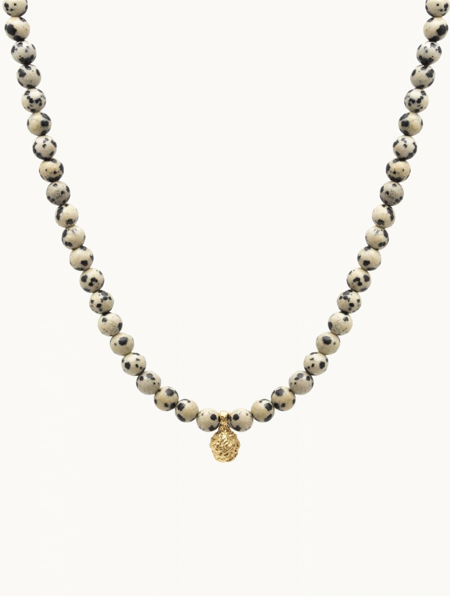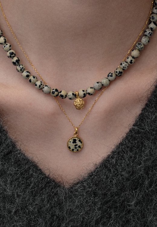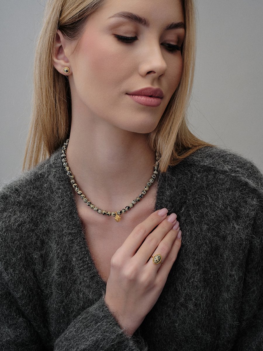 Naszyjnik DOTTIE z jaspisem dalmatyńskim to połączenie naturalnych kamieni i subtelnej formy inspirowanej naturą. Charakterystyczny, nakrapiany jaspis w zestawieniu z autorską zawieszką o organicznym kształcie tworzy harmonijną całość, która przyciąga uwagę i dodaje stylizacji lekkości.