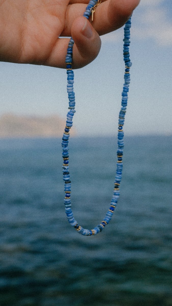 Naszyjnik El Mar z masą perłową to lekka forma inspirowana kolorem wody i jego naturalną zmiennością. Masa perłowa została tutaj barwiona w odcieniach błękitu i granatu, dzięki czemu każdy element delikatnie różni się tonem i układem koloru.