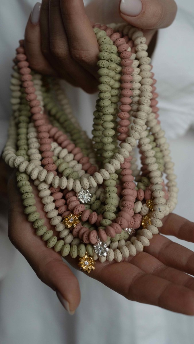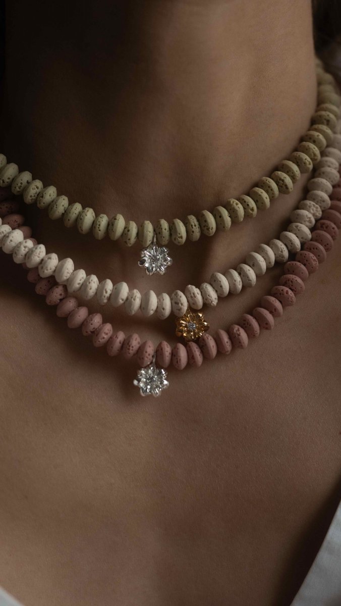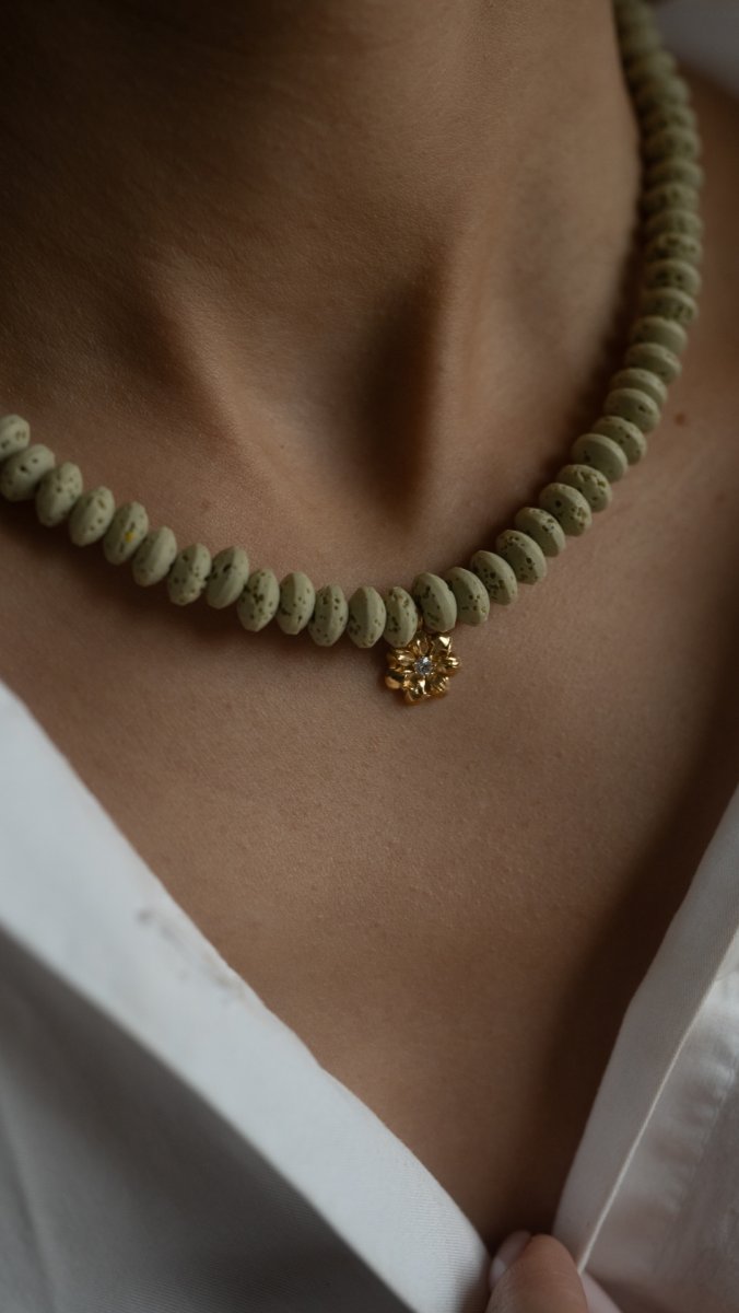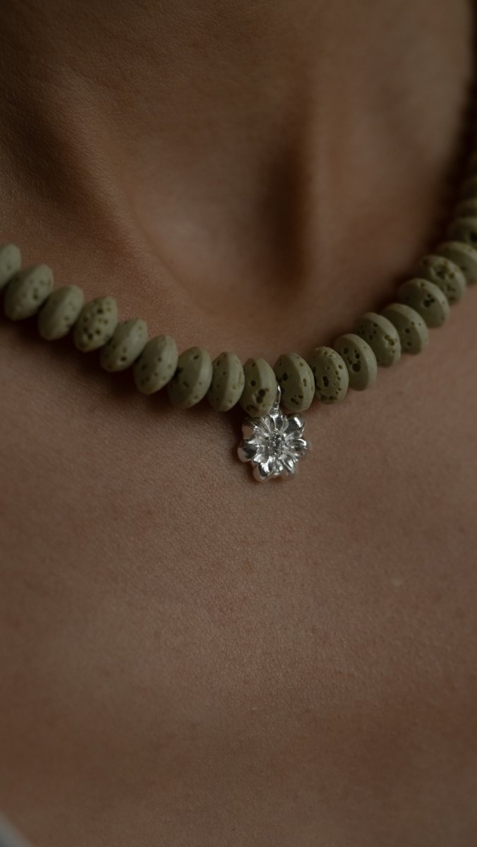 NASZYJNIK NO.08 SAGE GREEN – naszyjnik No.08 z zawieszką w kształcie kwiatka i naturalną lawą wulkaniczną w odcieniu sage green. Wyjątkowy, symboliczny i pełen charakteru – łączy delikatność formy z surową siłą natury.