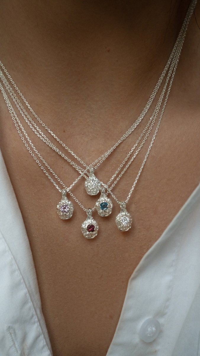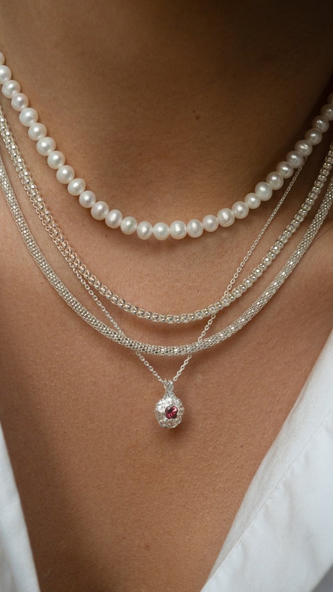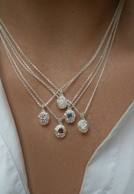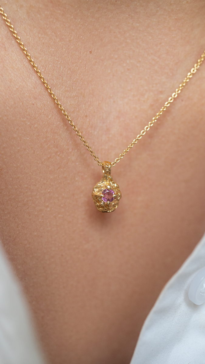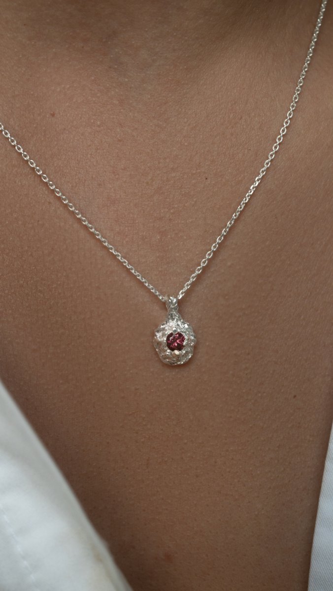 Naszyjnik RAW z turmalinem różowym to autorska biżuteria o wyrazistej, organicznej fakturze, która łączy surową formę z subtelnym, kobiecym kolorem kamienia. Nieregularna struktura srebra inspirowana naturą nadaje całości mocniejszy akcent, a turmalin różowy wprowadza energię miłości i harmonii.