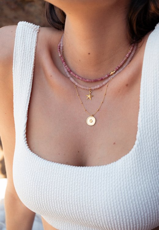 - Długość naszyjnika: 38 cm + 5 cm łańcuszka przedłużającego (regulacja 38–43 cm)