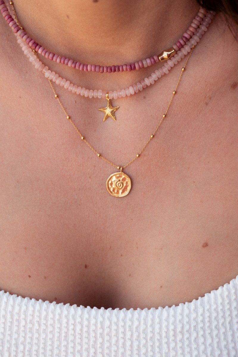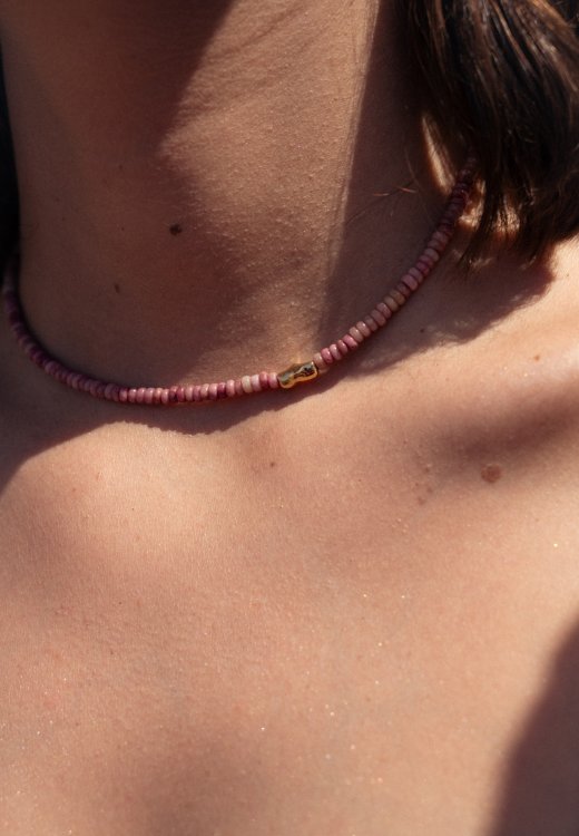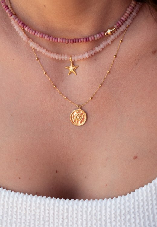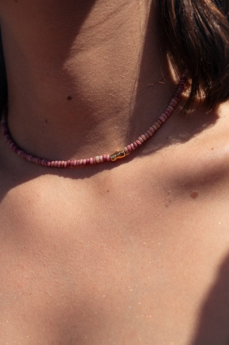 Naszyjnik Rock z rodonitem to ręcznie wykonana biżuteria, która łączy naturalne piękno kamienia z autorskim, organicznym charakterem. Rodonit przyciąga uwagę swoją wyjątkową barwą i subtelną strukturą, nadając naszyjnikowi głębi oraz indywidualnego wyrazu. Srebrna zawieszka ze srebra 925, pozłacana 2 mikronami 24-karatowego złota, dodaje całości delikatnego blasku i elegancji.