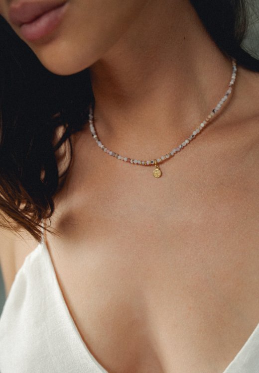 Naszyjnik Tiny Flowers z opalami to lekka forma, w której główną rolę grają opalowe kamienie – drobne, pełne miękkiego światła, zmieniające się w zależności od ruchu i kąta patrzenia. Mają w sobie coś spokojnego, trochę nieuchwytnego, jak moment, który trudno zatrzymać.