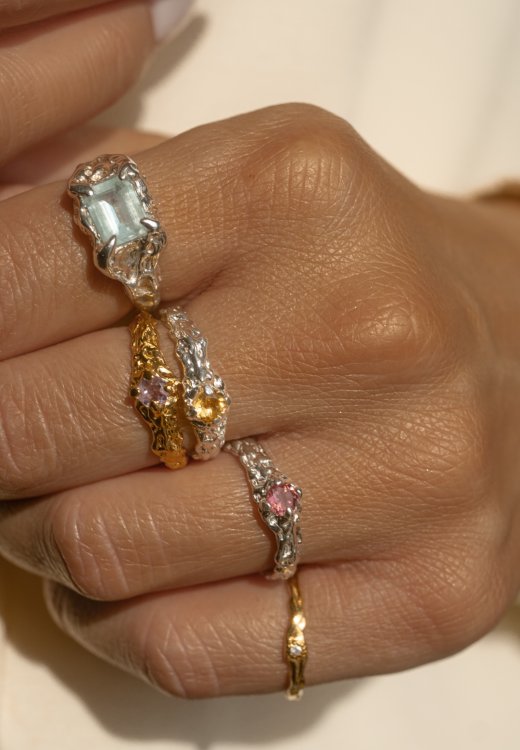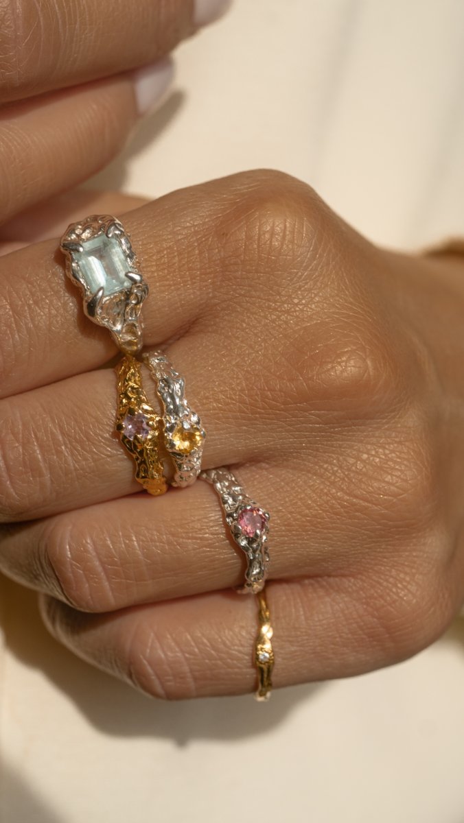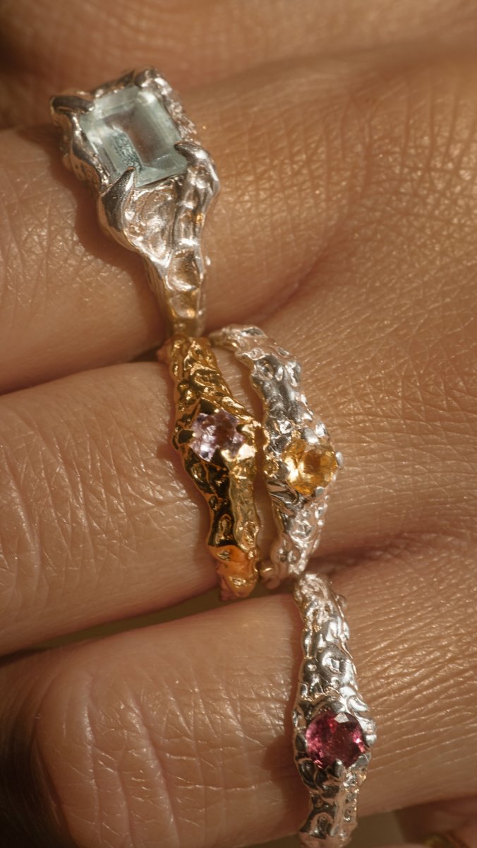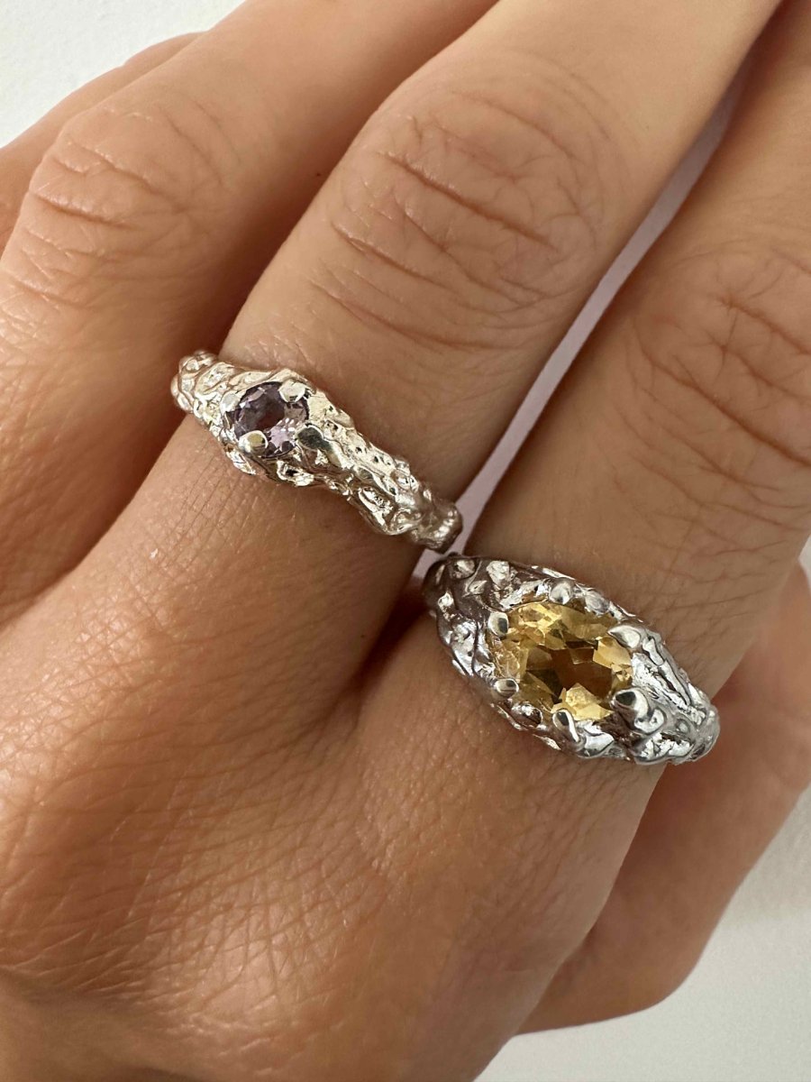 Pierścionek RAW no.3 z ametystem z serii RAW to hołd dla niedoskonałości i siły natury. Surowa, charakterystyczna faktura nadaje mu unikalny, nowoczesny wygląd, który przyciąga wzrok i podkreśla indywidualny styl.